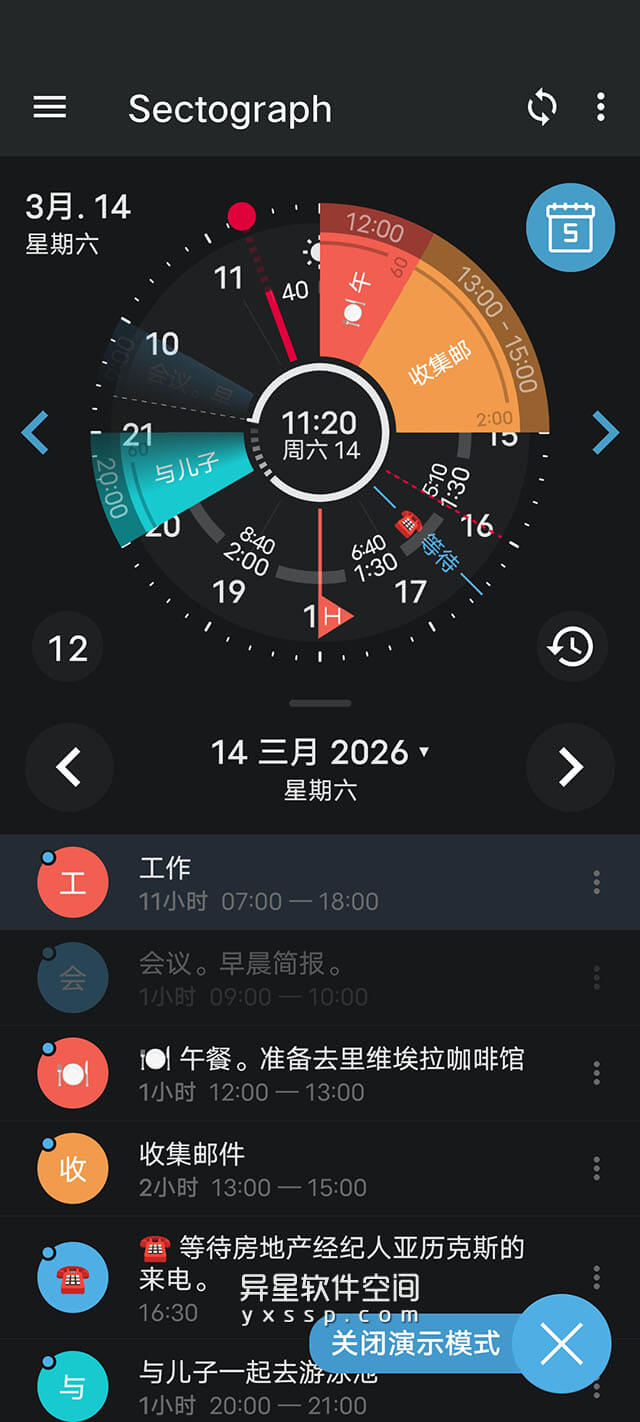 Sectograph Pro 日历和模拟时钟相结合,为您的工作提供惊人的视觉表现,让您有效地计划和计算规划利用好您的每一天。