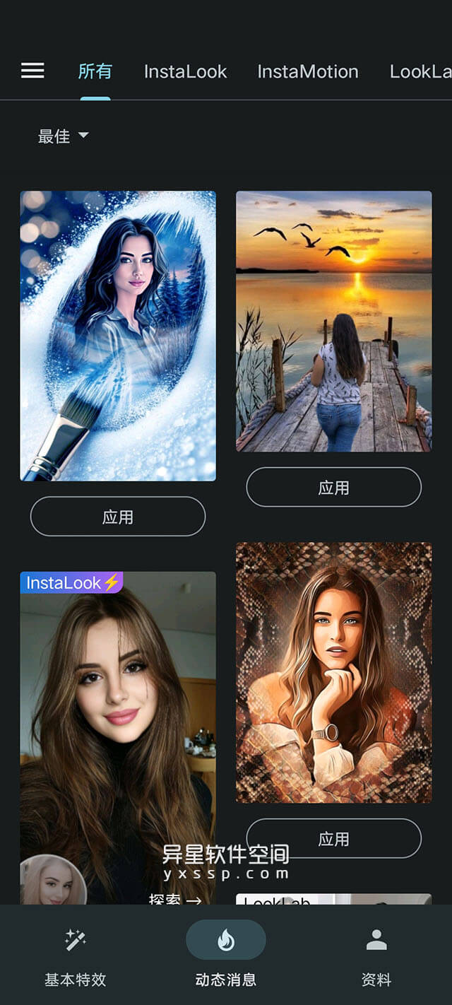 Photo Lab PRO 的使用也是极其的简便,您只需找到自己中意的效果模版并点开它,然后在界面下方选择自己的图片,最后点击右下角的绿色→按钮,稍等即可实现该模版效果,这一切无需登录……等等复杂的操作,简单吧!当然,过程中您也可以进行大小调整,以及添加各种的滤镜、动态效果和文本等等。