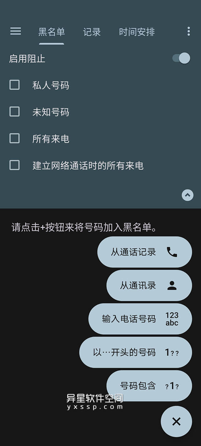 轻松将不需要的号码添加到您的“黑名单”中,可以从通话记录(在PRO版本中可用),联系人列表或手动输入号码。
