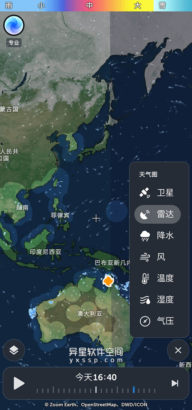 Zoom Earth 是一款交互式全球天气地图和实时飓风追踪器。通过交互式天气地图,您可以查看当前天气状况,并了解您所在位置的降雨、风力、温度、气压等天气预报。借助 Zoom Earth Pro 您可以追踪飓风、风暴和恶劣天气的发展,监测野火和烟雾,并通过查看近乎实时更新的卫星图像,随时掌握最新天气状况。